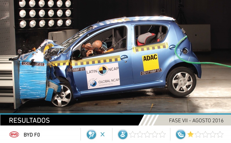 El BYD F0, fabricado en China, fue probado en la versión más básica de seguridad disponible en los mercados de Latin NCAP. La falta de bolsas de aire explica el resultado pobre en el test ya que la estructura fue calificada como estable en el impacto frontal. La baja calificación para protección de ocupante infantil se debe a las lecturas elevadas en los dummies durante la prueba, la falta de cinturones de seguridad de tres puntas en todas las posiciones, instrucciones escasas en el manual en referencia a protección infantil y puntaje bajo en la instalación de los Sistemas de Retención Infantil (SRI). El F0 no fue probado en impacto lateral debido a que en impacto frontal obtuvo cero estrellas. Sin embargo y en contraste con el más caro y también probado este año Peugeot 208, el BYD F0 al igual que Fiat New Palio y el Kia Picanto ofrece protección básica estructural e interior para impacto lateral como refuerzos de puertas.