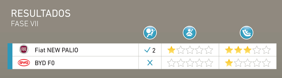 La versión más básica de equipamiento de seguridad del BYD F0 decepcionó al obtener cero estrellas para ocupante adulto y sólo una estrella para ocupante infantil. El modelo, similar al reconocido Peugeot 107, ofreció una estructura estable en el impacto frontal, pero registró lesiones de elevada gravedad en los dummies adultos posiblemente debido a la carencia de bolsas de aire. El Fiat New Palio obtuvo solo una estrella para ocupante adulto y tres estrellas para protección de ocupante infantil. La calificación de adulto se debió a los registros en el pecho del dummy en el impacto lateral a pesar del buen desempeño de la estructura durante ese impacto. En protección infantil el modelo obtuvo protección máxima en impacto lateral.