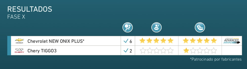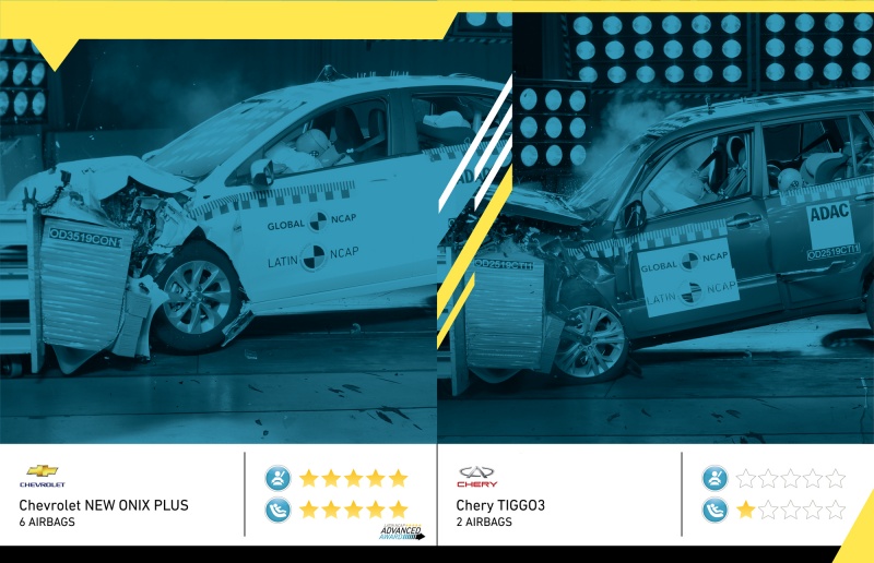 Últimos resultados de Latin NCAP: El New Onix Plus logra cinco estrellas para ocupantes adultos y niños y Premio Advanced Award por Protección a Peatones. Chery Tiggo3 decepciona ampliamente con resultado de cero estrellas