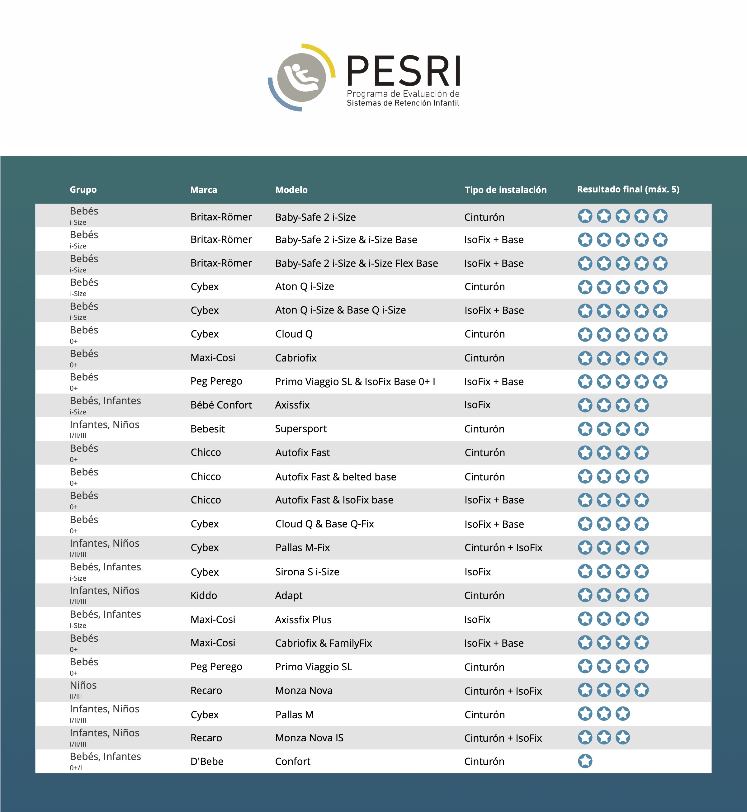 Los resultados generales están en línea con años anteriores y confirman que los asientos multigrupo pueden comprometer la seguridad, principalmente para los SRI instaladas con cinturón de seguridad. Sin embargo, tres SRI multigrupo (Pallas M-Fix, Kiddo Adapt y Bebesit Supersport) tuvieron un puntaje de cuatro estrellas.