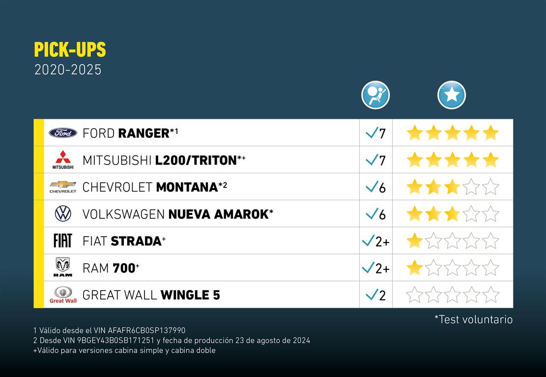 Bajo el protocolo de evaluación actual que finaliza en diciembre del 2025, Latin NCAP ha evaluado seis modelos de camionetas pick up vendidas en la región: las medianas Mitsubishi L200/Triton, Ford Nueva Ranger, Volkswagen Amarok y Great Wall Motors Wingle 5 y las pequeñas Chevrolet Montana y Fiat Strada, y su gemela corporativa la RAM 700.