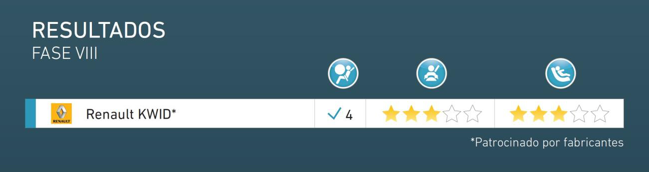 O Renault Kwid, produzido no Brasil, ganhou três estrelas na proteção do ocupante adulto e três estrelas na proteção do ocupante infantil. O modelo, que se tornou um dos mais vendidos depois de ser lançado, foi avaliado em configurações de batida de impacto frontal e lateral. O Kwid mostrou uma proteção frontal adequada e proteção marginal contra impactos laterais com uma proteção fraca no peito do adulto, porém suficiente para alcançar as três estrelas sólidas na proteção deste ocupante. No impacto lateral, a estrutura do Kwid evitou atravessar, de forma excessiva, a barreira de impacto lateral que, combinado com o airbag do tórax lateral, conseguiu manter as lesões dos adultos por baixo da alta probabilidade de risco de vida. Os ocupantes crianças mostraram uma proteção adequada e boa nos testes de impacto frontal e lateral, devido a que os SRIs foram instalados utilizando ancoragens ISOFIX e Top Tether. O Kwid oferece ancoragens ISOFIX padrão, contudo, não conta com interruptor para desativar o airbag frontal do passageiro, caso seja necessário instalar um Sistema de Retenção Infantil (SRI) olhando para trás. Isso e a falta de cintos de três pontos em todas as posições explicam a qualificação de três estrelas para a proteção infantil.