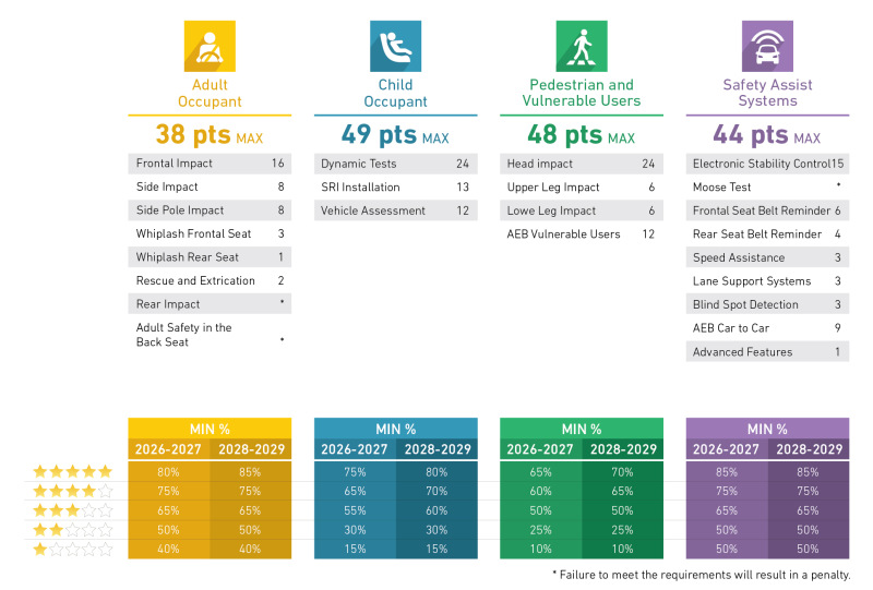 Na área de Assistências à Segurança aumentam a exigência na velocidade do teste do alce e a falha em qualquer um desses testes em diferentes velocidades é penalizada com perda de pontos. As avaliações de Frenagem Autônoma de Emergência de baixa e alta velocidade e dos Sistemas de Apoio de Faixas passam a incluir cenários mais exigentes em relação à configuração dos testes. A Detecção de Ponto Cego (BSD) também passa a ser avaliada em novos cenários, buscando a implementação de sistemas robustos dessa importante tecnologia.