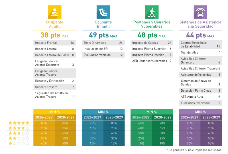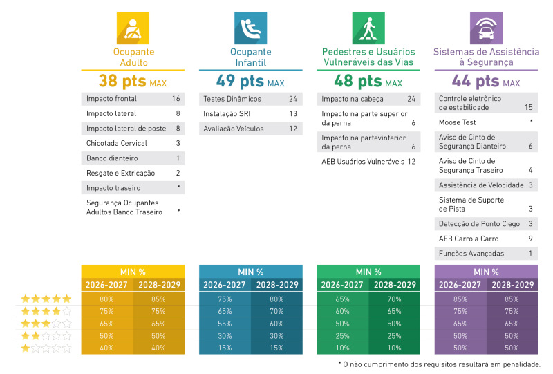 Nesta atualização do protocolo do Latin NCAP, aumentaram os requisitos necessários para se obter estrelas e, ao mesmo tempo, penaliza-se a falta de aspectos básicos de segurança. As quatro grandes áreas de avaliação permanecem inalteradas: 1) Proteção de Ocupante Adulto; 2) Proteção de Ocupante Infantil; 3) Proteção a Pedestres e Usuários Vulneráveis das Vias e Sistemas de 4) Assistência à Segurança.
